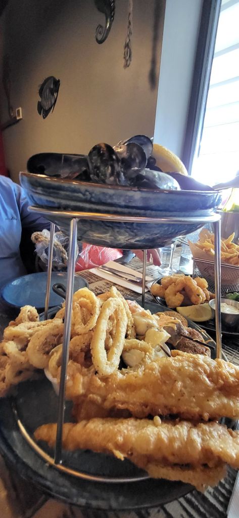 We buy fish and oysters for our lunch tomorrow, and settle down to an early dinner in Crabby Joe’s….just a light seafood platter and some tempura prawns…