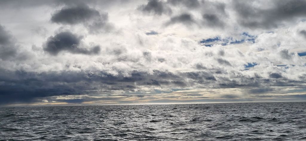 There is no spectacular dawn today, just a gradual and very faint lightening of the sky. We start to make out a horizon, and then gradually more detail of waves and clouds. Taking turns to snooze is not easy, as the motion is quite bumpy at times, but as the morning wears on the drizzle fades, the wind lessens, and even the waves show signs of easing.