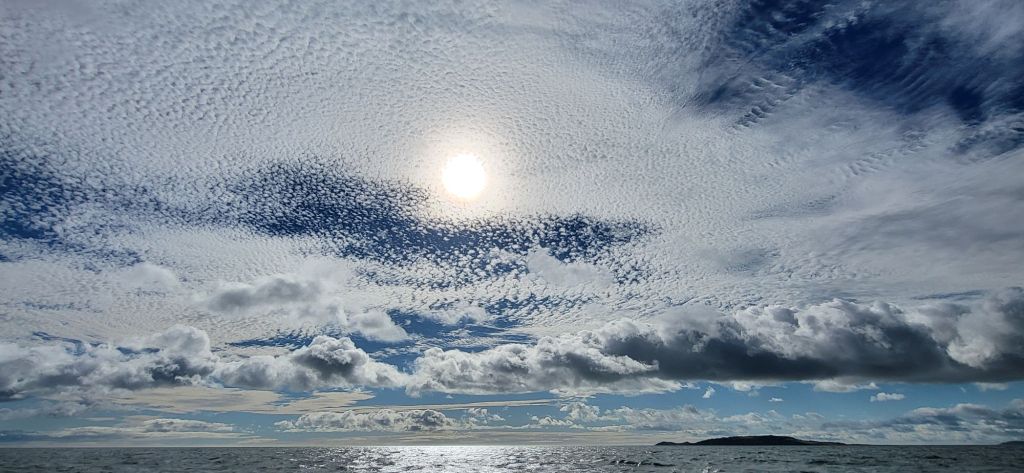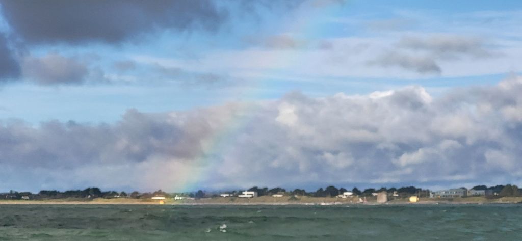 Heydays soon settles in to a decent 6 knots through the water, and we even have time to muse over the weather fronts coming through, bringing some amazing clouds and even a rainbow.