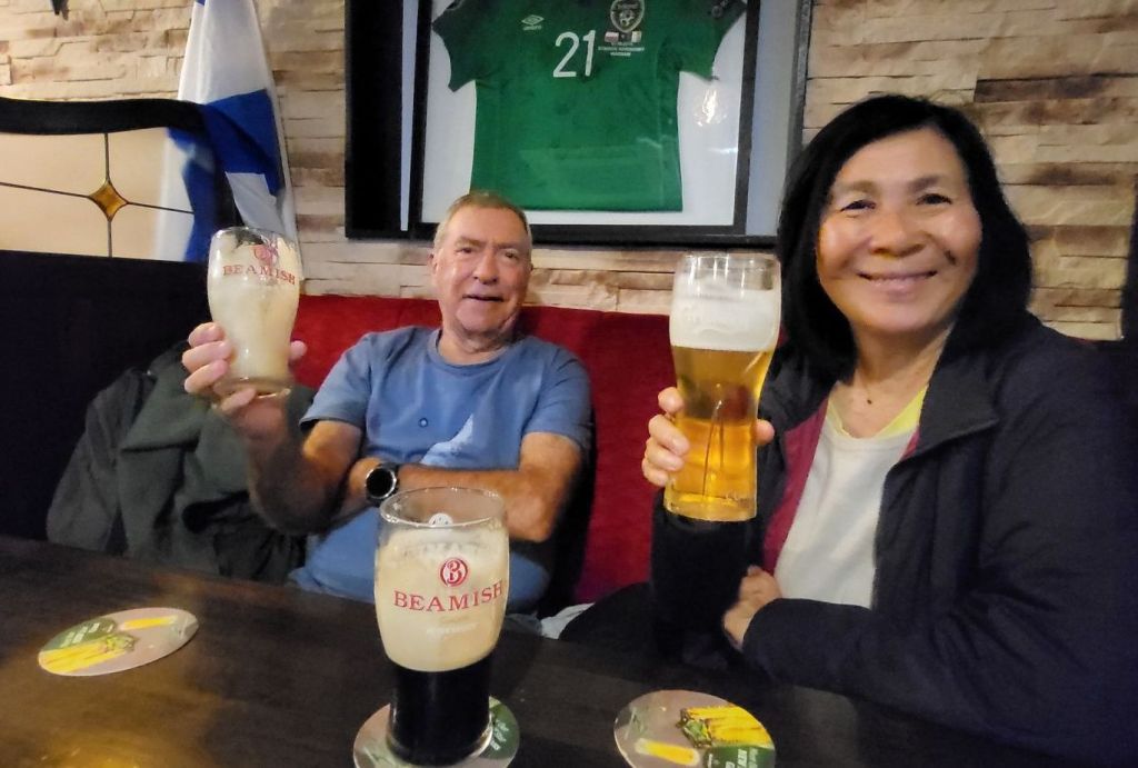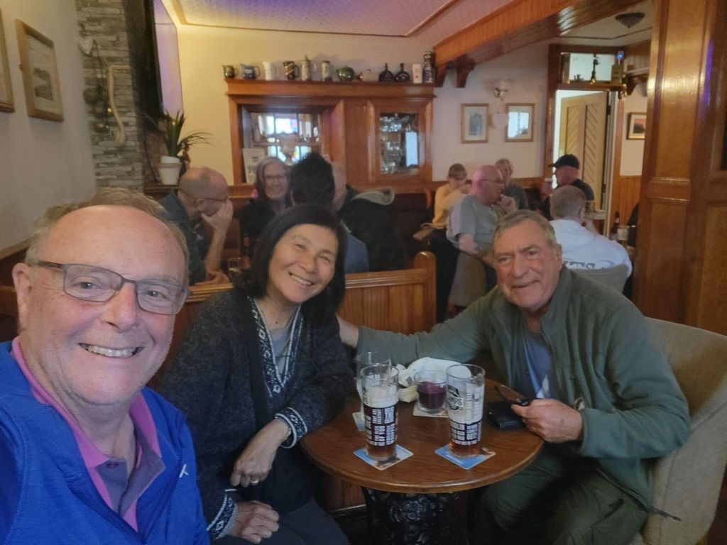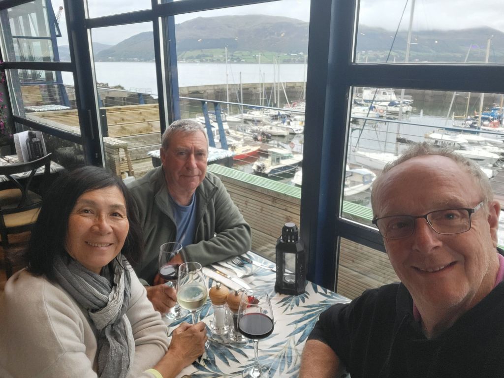 Larne itself has seen better days. It reminded us in some ways of Grimsby, with its shuttered shops, the preponderance of vapes and tattoo parlours, and a slightly more modern, but nonetheless dispiriting shopping centre which has turned its back on the high street. A coffee stop turns into lunch/dinner of pie and mash for John and Yee Tak, and quiche and mash for James. With an hour left before the bus back, we set our sights on something more liquid. But this is an Irish town like none we have visited so far. There is not a pub or a bar in sight. We decide to walk back to the train station (near the bus stop) and find a bench for an hour…