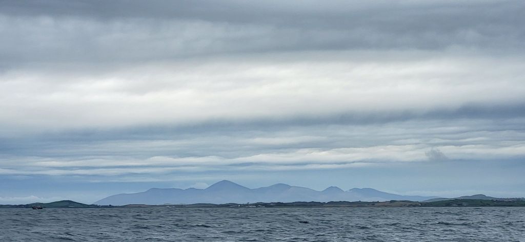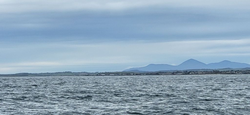 By early afternoon, Drogheda and the Boyne are well astern, and the Mountains of Mourne are clearly visible, and it is time for us to start to look for the lights and buoys to lead us in.
