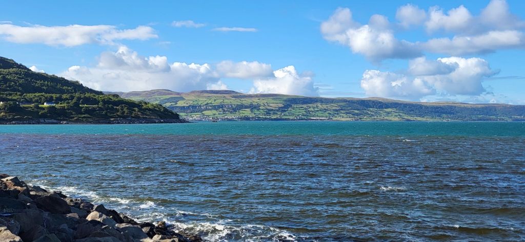 Freshly showered, we head off to catch a bus to Larne, which is the closest ‘big’ town. The drive along the coast is very pretty, with little villages clinging to the rocky shoreline, and the steep hillsides behind.