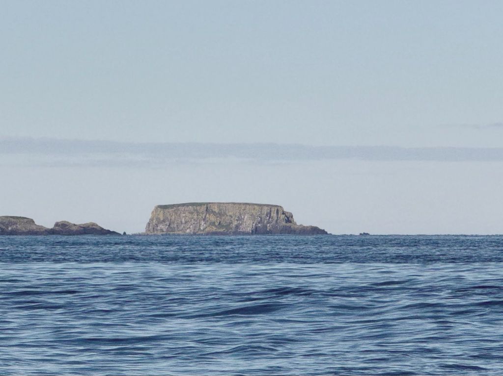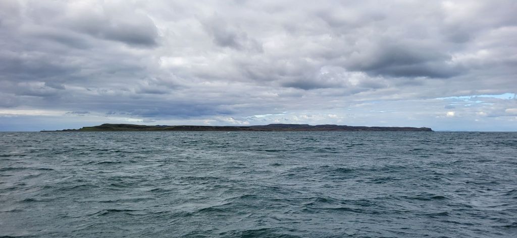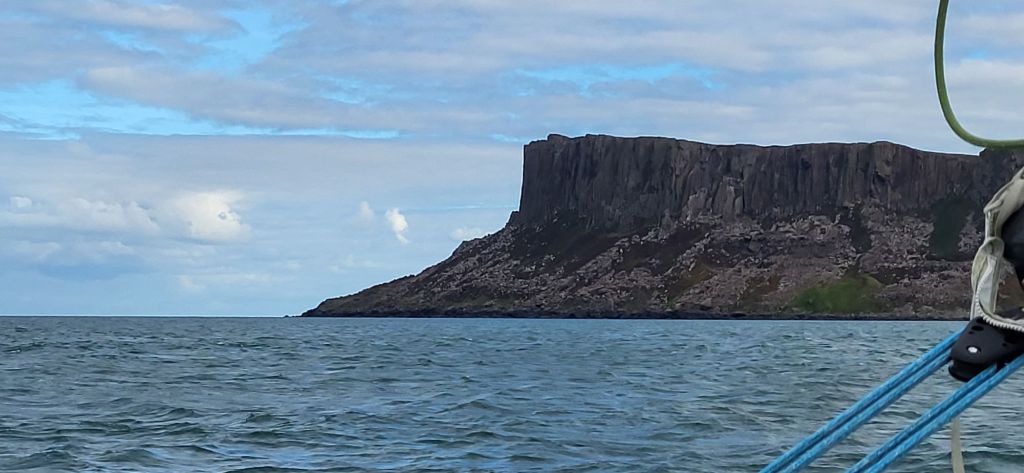 There is a slight breeze once we are further out and beyond Rathlin Island, and we get the main sail up. There’s not enough to push us along at anything over a knot over the ground, but it gives us a little, and so we are a bit like a hybrid.