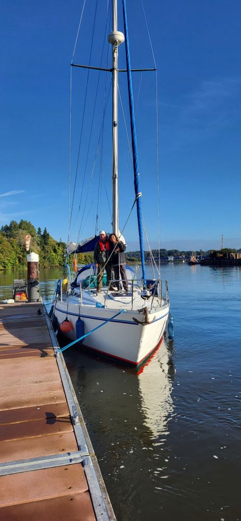…and we’re soon back alongside, ready to get her ready for our much delayed journey north. With the tide gate missed for today, Wednesday will be the start…