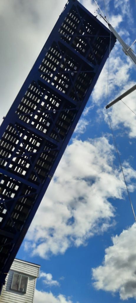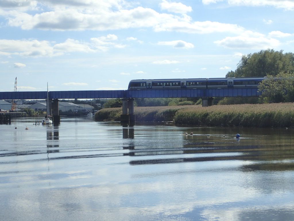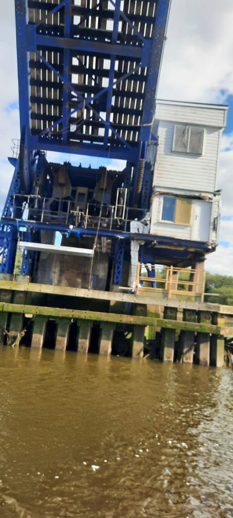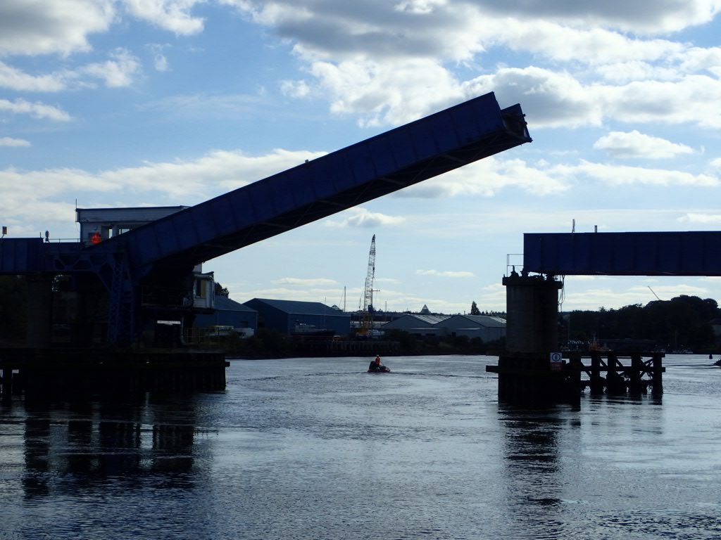 We approach the railway bridge a few minutes early….and hang about until the train is through and the bridge begins to lift…