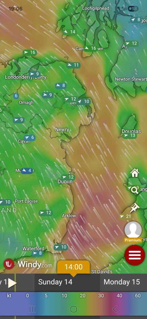 The direction of the flood (rising tide) and ebb (falling tide) changes in the north channel. This is the narrow stretch of water between Mull of Kintyre and Ulster. In the right (wrong?) conditions, this can set up some unpleasant standing waves and overalls, so timing is everything. The pilot books are clear…..get it wrong, and the best outcome is that you get spat out the way you came. Timing over the next few days will be everything…