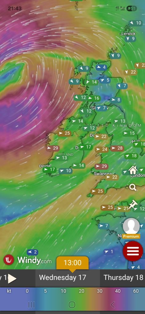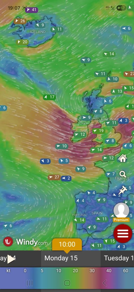 Sunday is looking decidedly rough with winds around force 6 or 7…….and Monday is even worse as a deep low passes just north, bringing gales at the least.