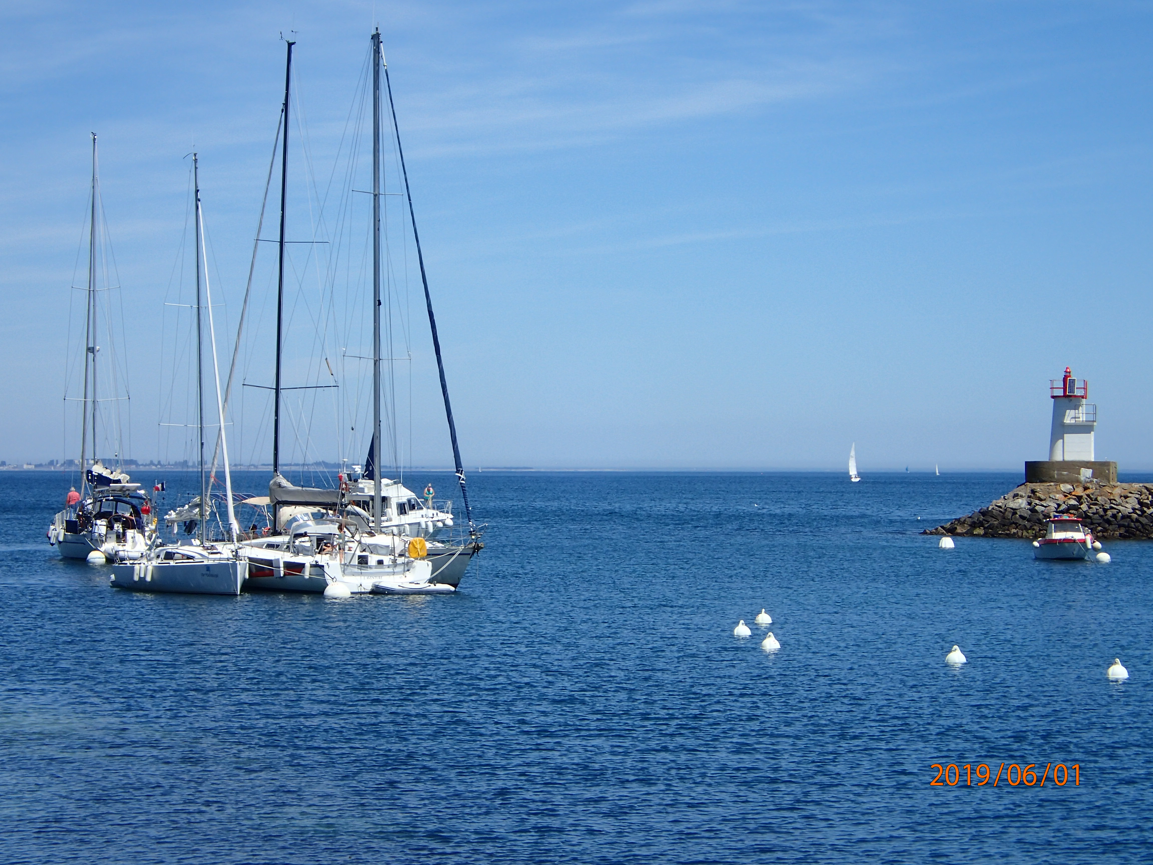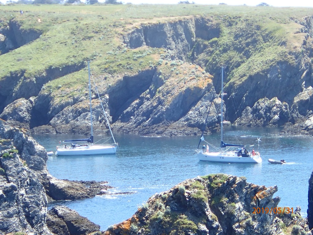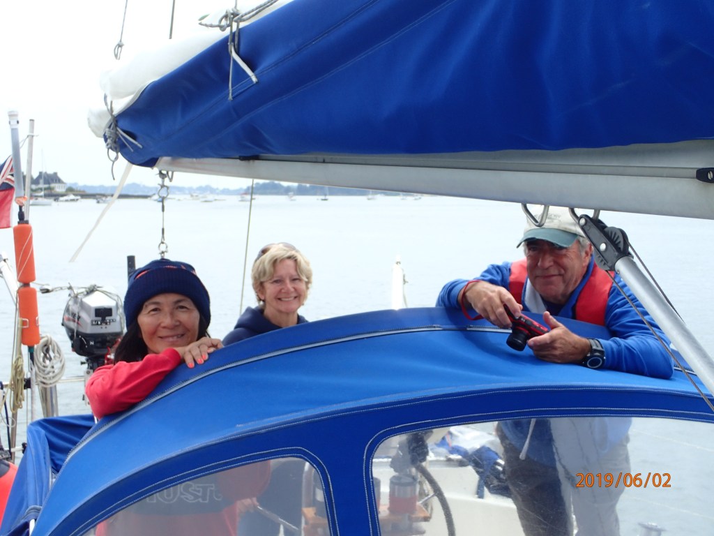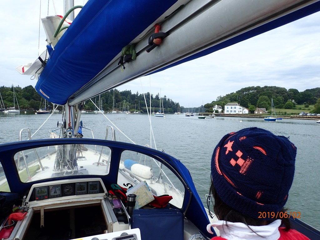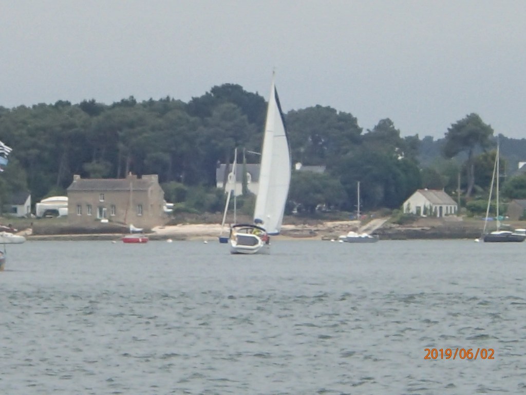 The day is overcast, but with a steady 8-10kts from just over the port quarter we join what seems like half the French nation out on the water. In some respects this is a bit like the Solent on a bank holiday, but….everyone is sailing. We have mentioned this before, but the French seem not to have fallen under the spell of Sunseekers and penis extensions in the same way that many Brits have. The Solent on a Sunday is not exactly quiet, with big motor boats powering up and down in a hurry to get…where? We like to think of ourselves as an island seafaring nation, but when it comes to sailing the French seem to be much more egalitarian and, dare we say, less snobbish. There are still lots of young people/couples in small (8-10m) sailing boats. Certainly, moorings and upkeep seem a lot cheaper here compared to the south coast of England. It all seems more akin to the more northern and eastern parts of Scotland…brilliant.