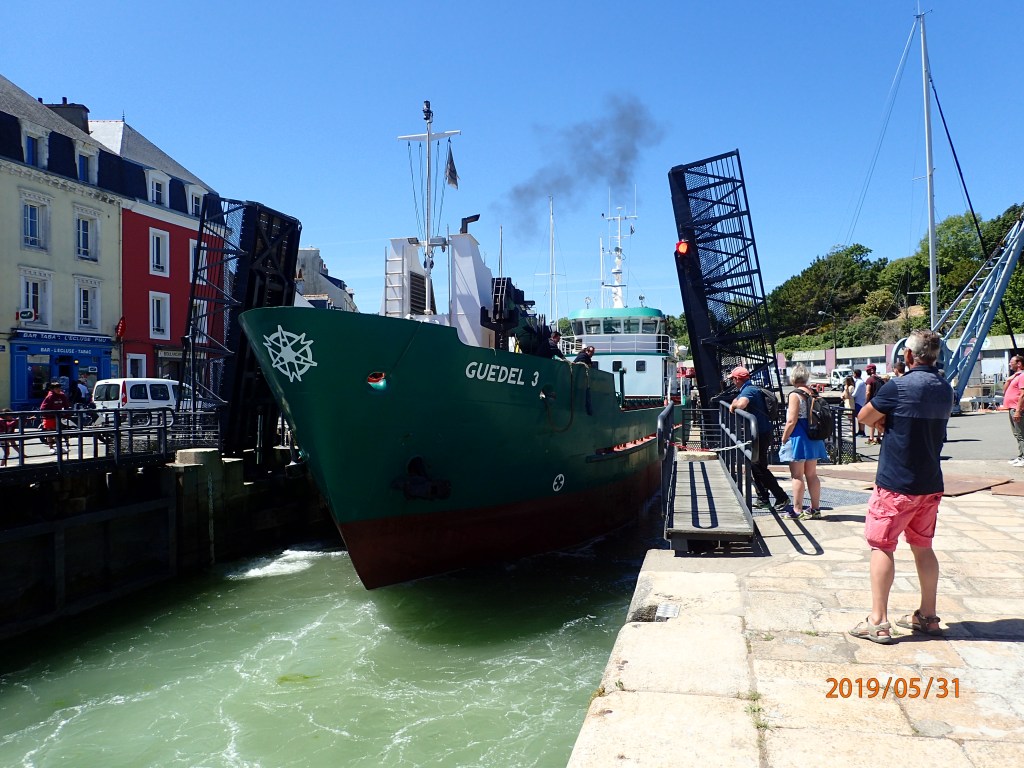 The currents around the Gulf are very strong and the pilot books all warn about the dangers of being swept into places one would rather not be swept. We plan to get through the entrance and up the Auray River on the rising tide and leave our mooring at Le Palais at a respectable hour for a Sunday morning having made one last trip to the market, the boulangerie and the small shop for essentials such as wine and loo rolls.