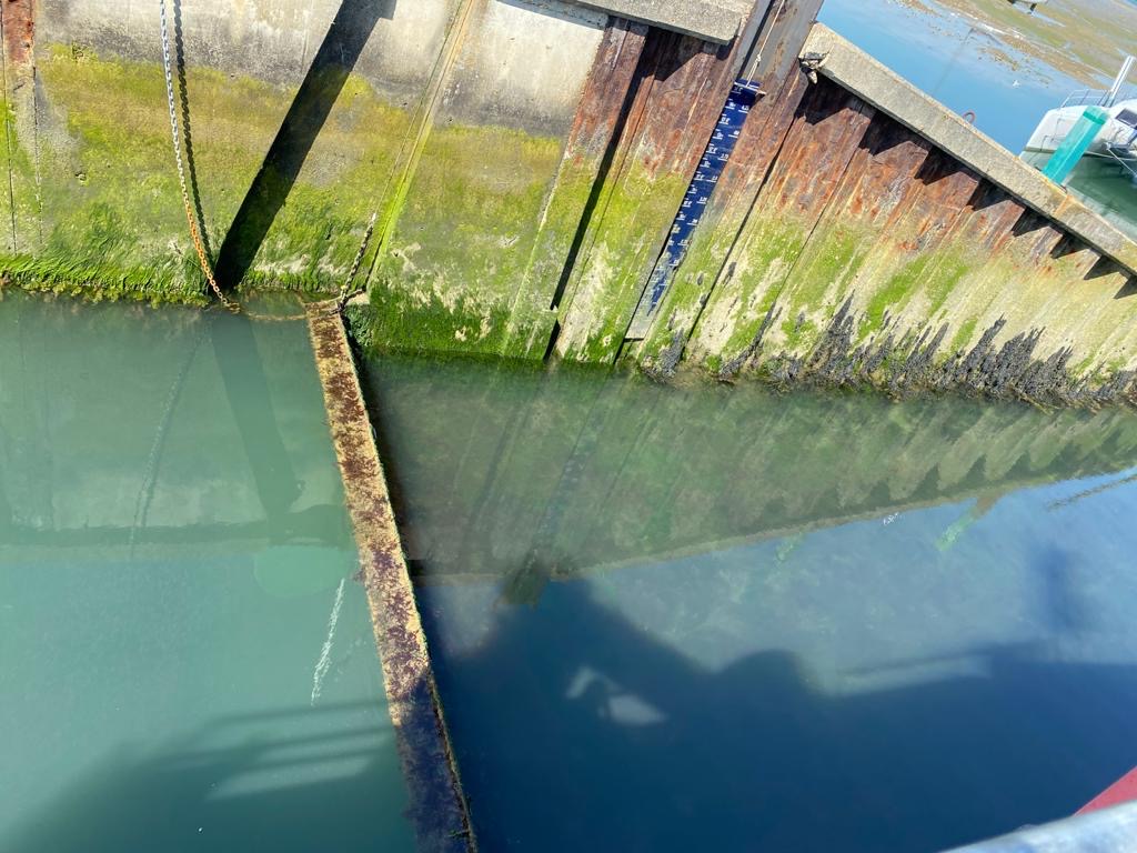A boat near us decides to turn around but the wind makes it very difficult for them…and as always there are plenty of onlookers all of a sudden. So after using up most of our eggs for a last breakfast, it is with some trepidation that we prepare to cast off ourselves. As it happens it all runs very smoothly and we are smugly putting away lines and fenders when we get shouted at by the harbourmaster from the shore. It turns out that we can’t leave as the big barge and tugs are coming in, there is not room for us all and would we mind awfully tying up on his bit of the dock…or words to that effect. There ensues a scramble to get lines and fenders out again, although by this time more people are interested in the tugs than us…