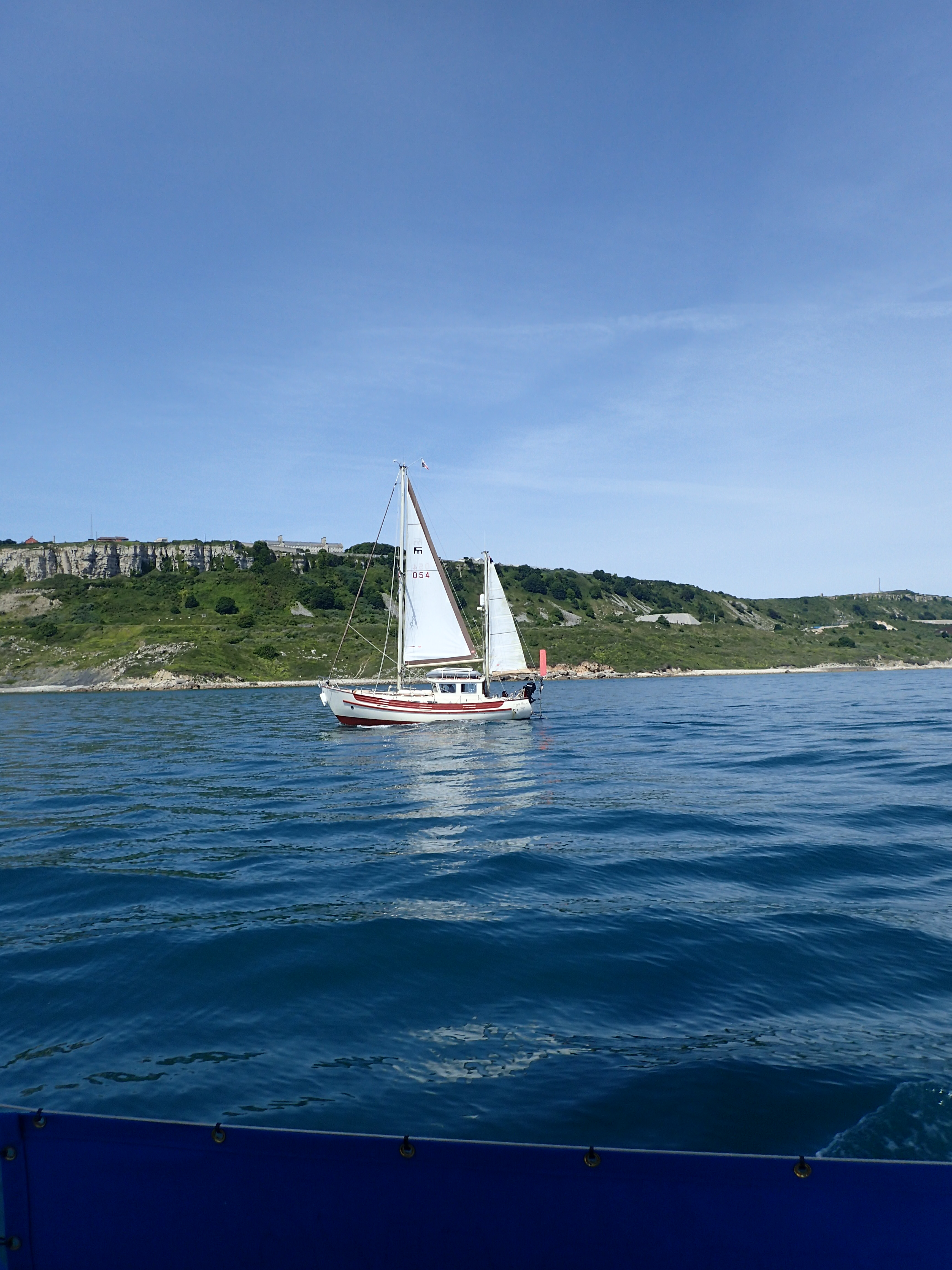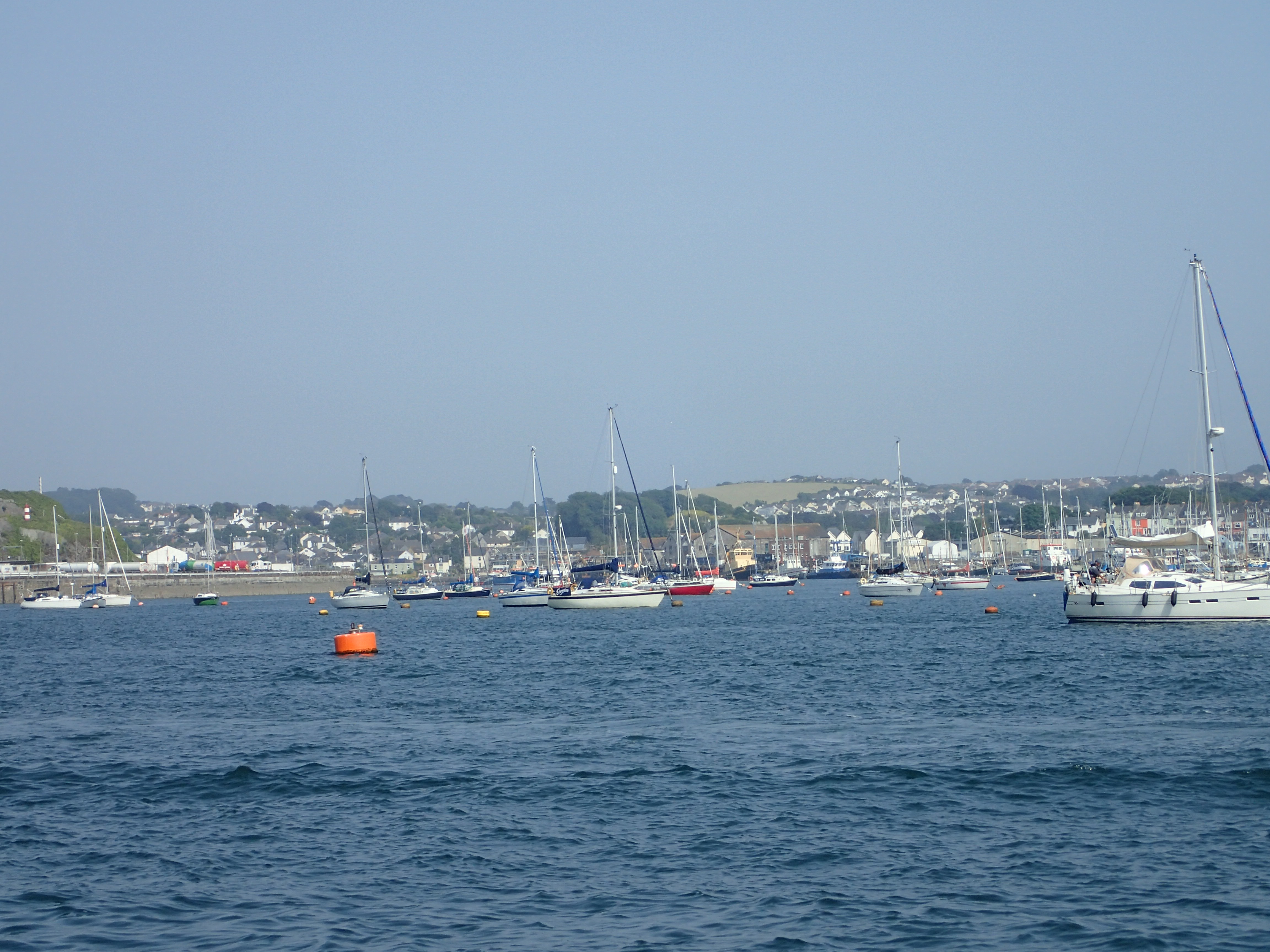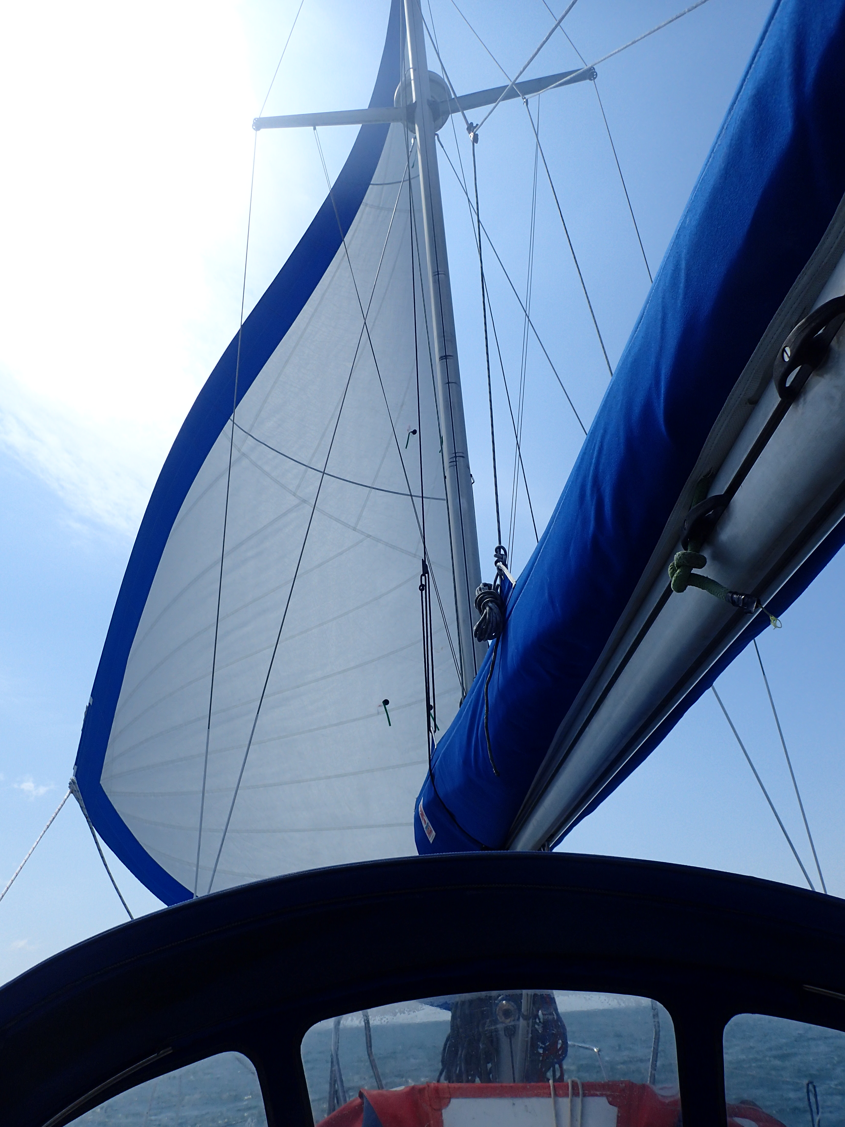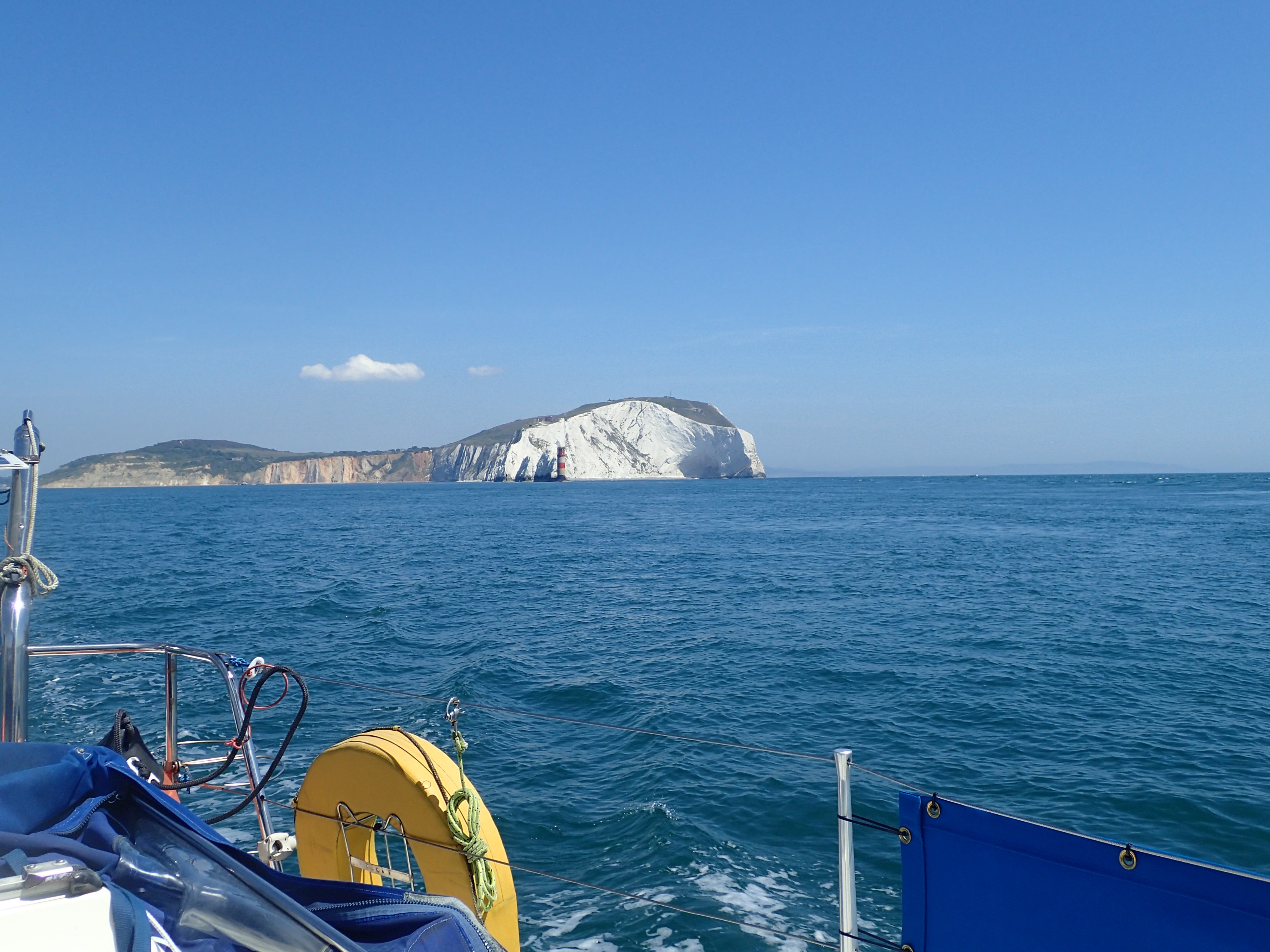 We decide to call it a day and head in for Portland, especially as the latest forecast for our bit of inshore waters talks about a strong wind warning. We are certainly right in the upper ends of a F6 with gusts well over. We head for the narrowish gap between the race and the western end of the shambles bank with just a genny left flying on a dead run. Even though we are some way clear, the water is still confused and very choppy, but then, all of a sudden, we are free and enter the relative calm of Portland Harbour. We are intending to anchor but a lot of inviting and empty buoys beckon and soon we are riding out the worst of the weather courtesy of the Royal Navy Sailing Association. There is something deeply satisfying eating a meal on board while the weather does its thing outside, knowing that we are snug and secure.