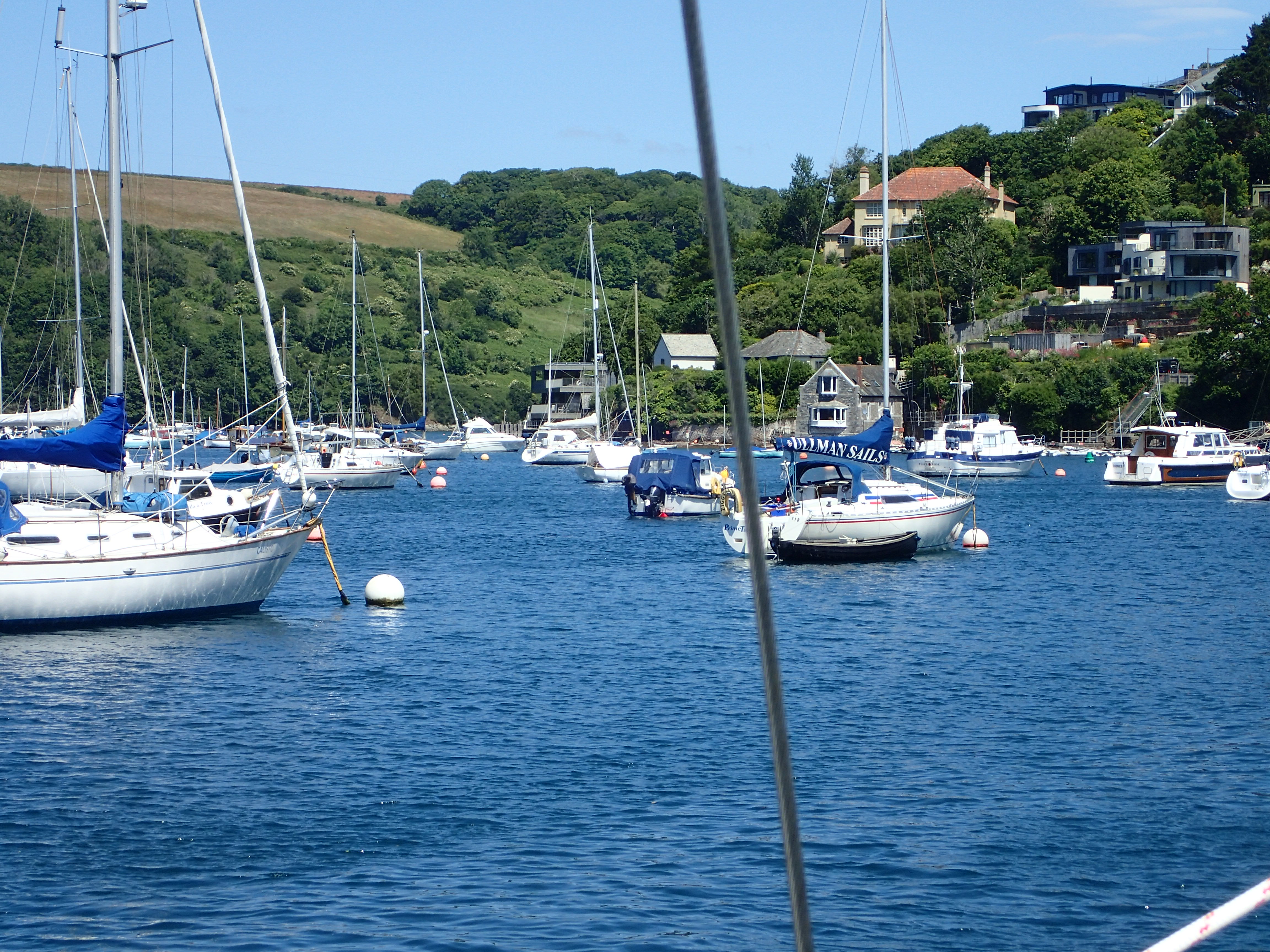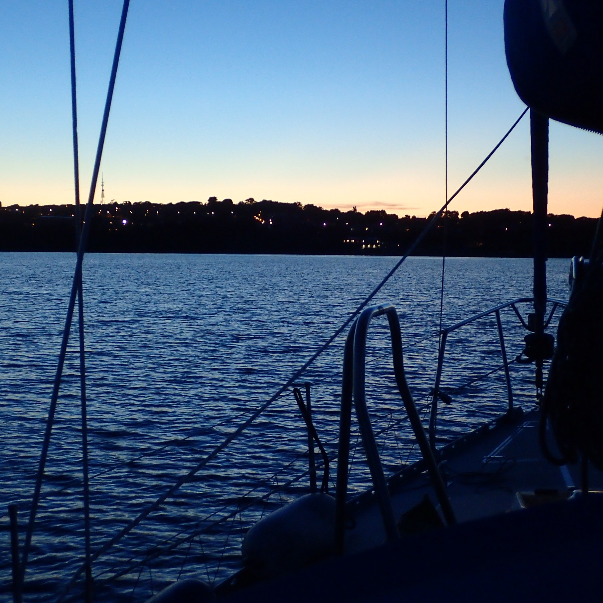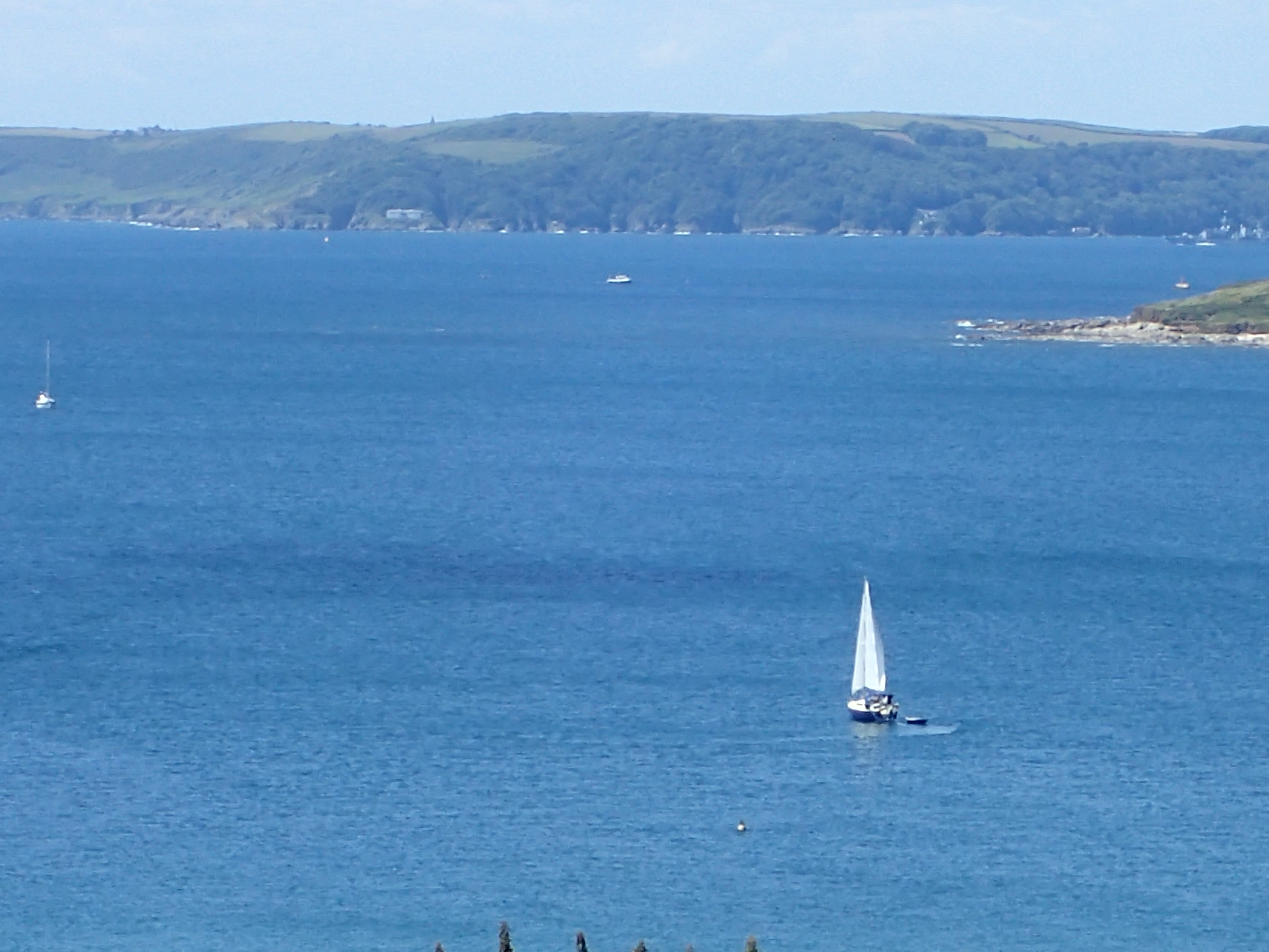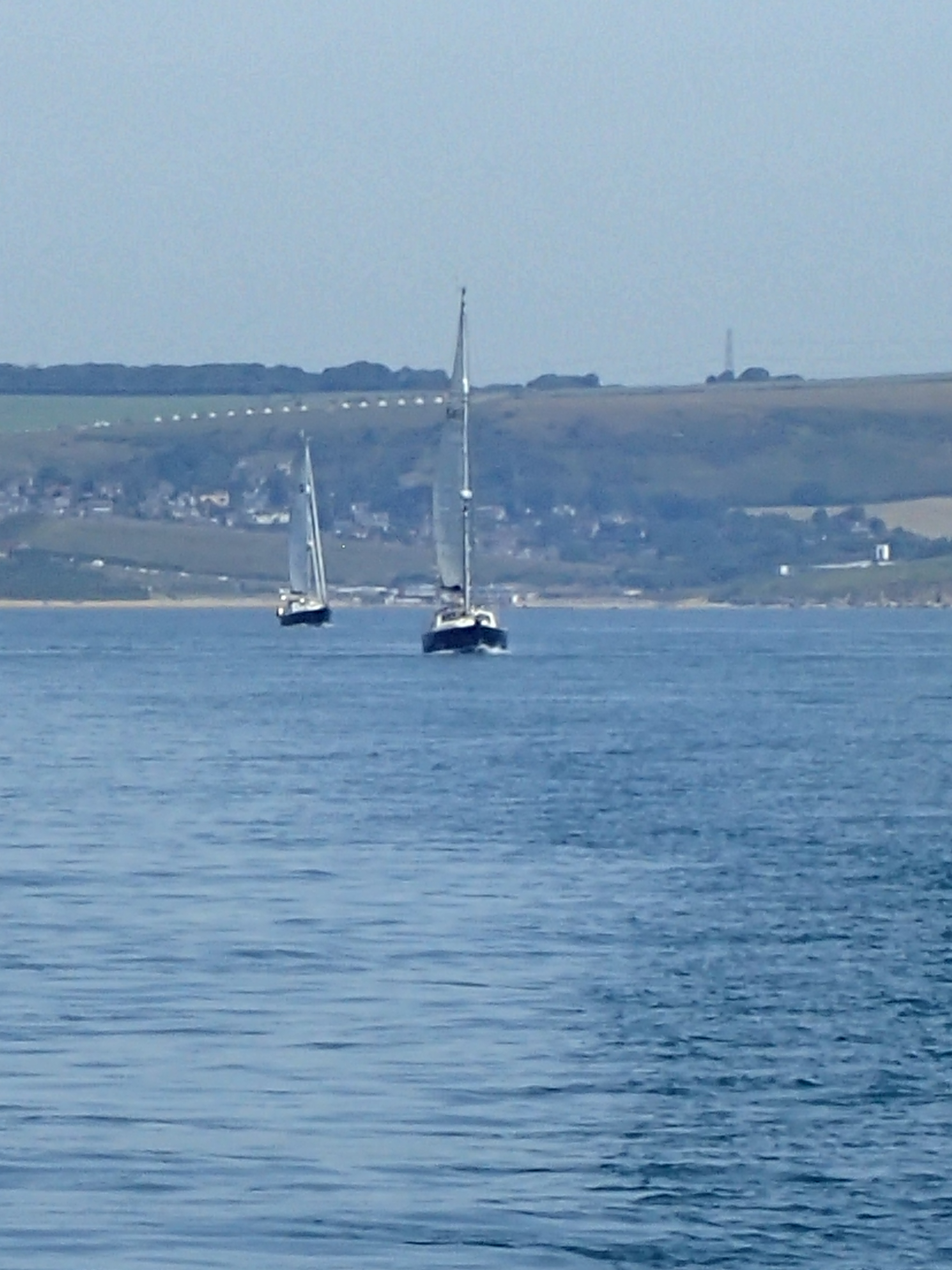 We decide to call it a day and head in for Portland, especially as the latest forecast for our bit of inshore waters talks about a strong wind warning. We are certainly right in the upper ends of a F6 with gusts well over. We head for the narrowish gap between the race and the western end of the shambles bank with just a genny left flying on a dead run. Even though we are some way clear, the water is still confused and very choppy, but then, all of a sudden, we are free and enter the relative calm of Portland Harbour. We are intending to anchor but a lot of inviting and empty buoys beckon and soon we are riding out the worst of the weather courtesy of the Royal Navy Sailing Association. There is something deeply satisfying eating a meal on board while the weather does its thing outside, knowing that we are snug and secure.