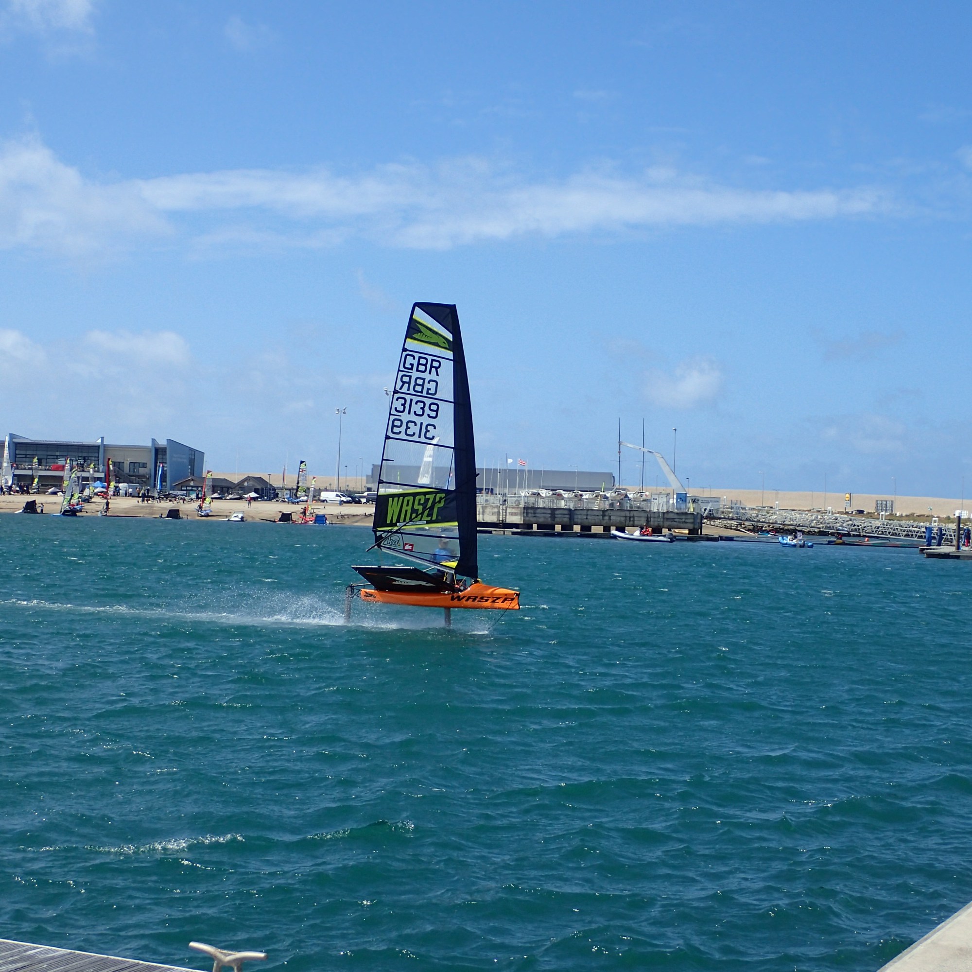 The harbour is a playground for fit young men and women and these strong winds are like manna to them. There are kite surfers, windsurfers on foiling boards and most amazingly a fleet of foiling dinghies called Waszps…