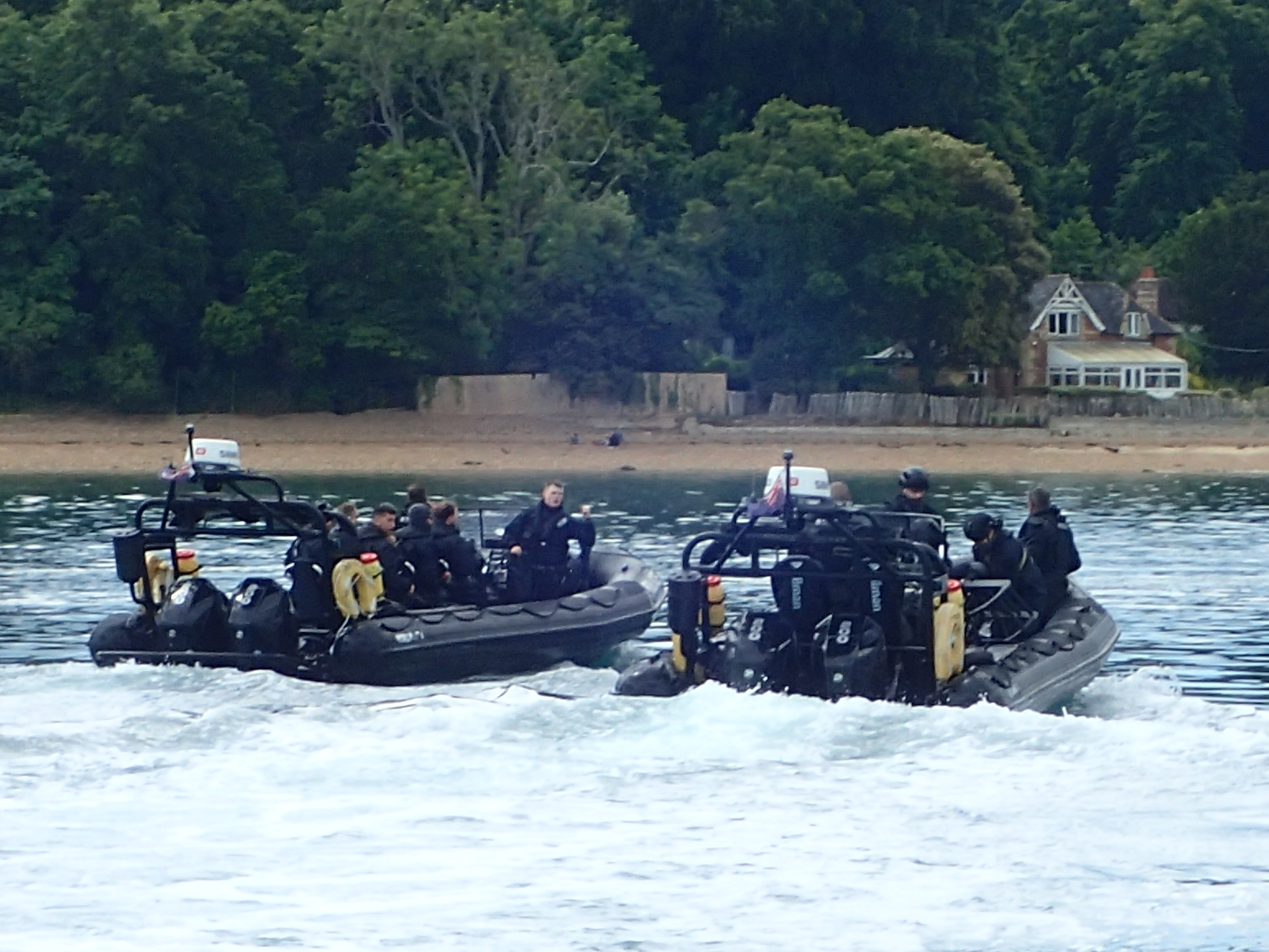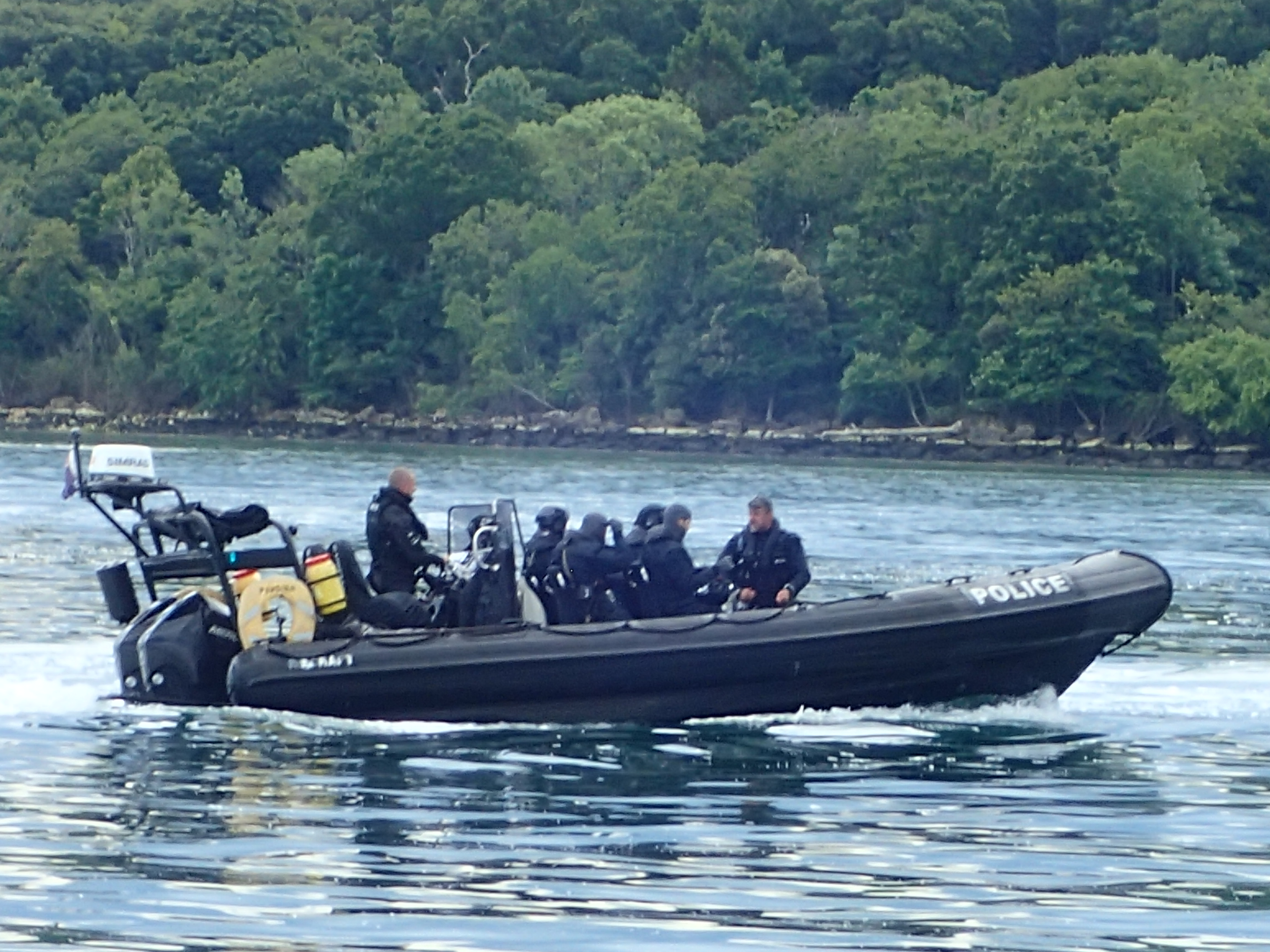 Just as we decide to head out again, our peace is disturbed by three black police ribs powering into the creek. They carry out a boarding exercise on the ferry…not initially successful as their ladder isn’t long enough. Presumably any villains on board would wait until the police got the right ladder.