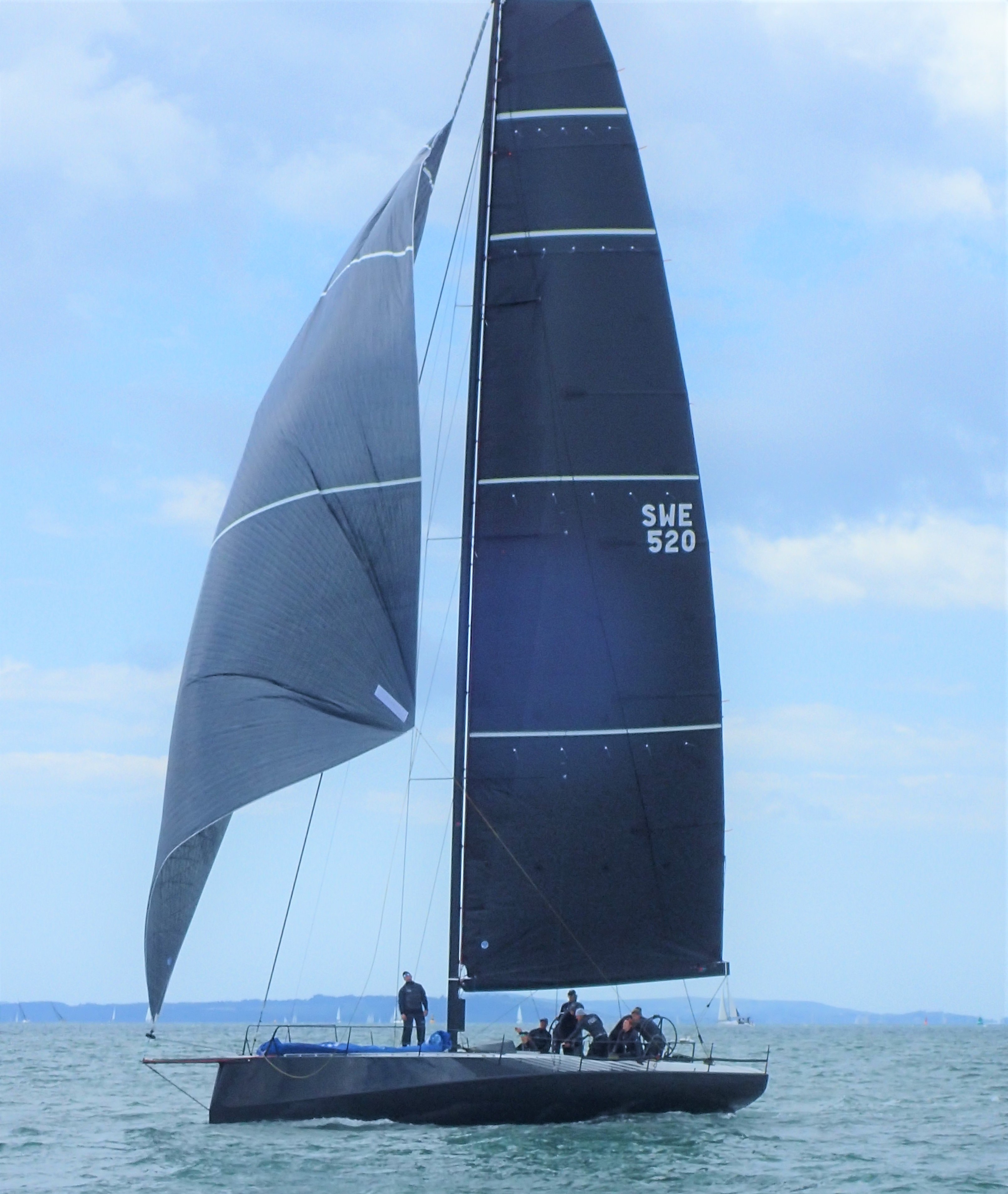 Back out in the Solent, the wind has filled from the south west and we enjoy a single tack round the east side of the Bramble Bank and up Southampton Water where we plan to pick up Chris from the train. A few other yachts are out including a design/paint-job which provides a disturbing optical illusion…