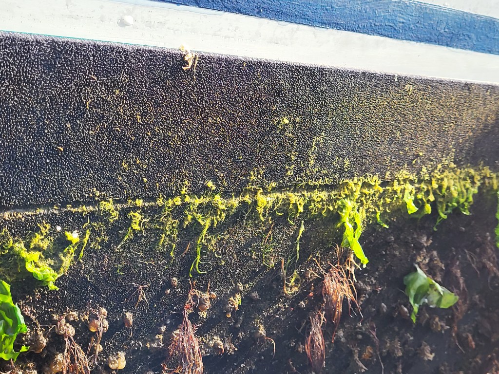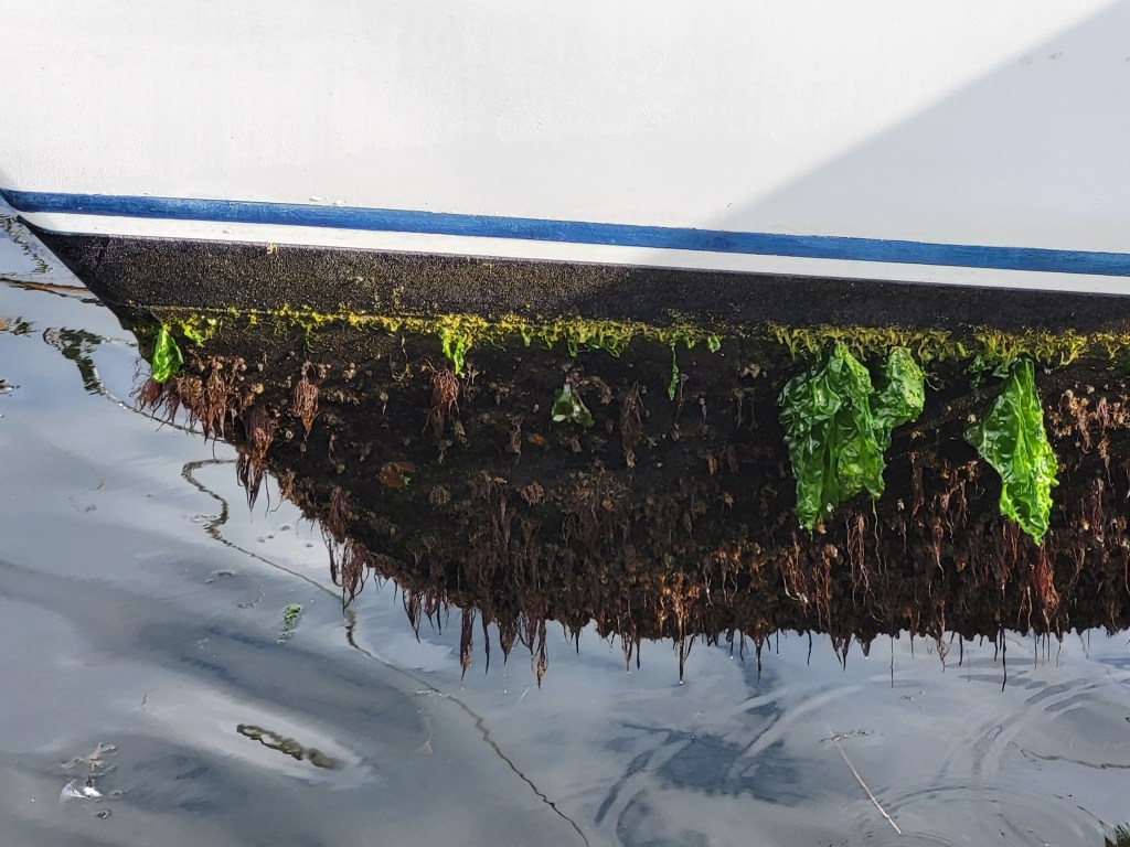 Now, the original ‘blurb’ suggested that any growth which did appear, could easily be removed by a gentle scrape. It was a warm and sunny late August. Onlookers, in between licking ice-creams or sipping beers, enquired why we had a garden on the bottom of our boat. They were further encouraged when, having failed with light scraping, we took a garden hoe to the jungle we had been lugging around the high seas.