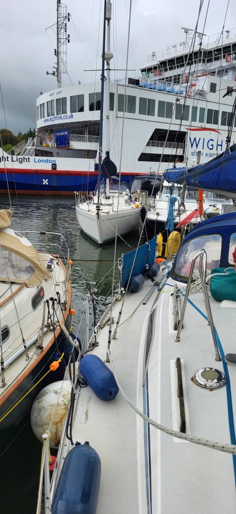 Back on board we’re nicely tucked up with a rum when there is a knock on the window and a boat is trying to get into the berth behind us. We dutifully undo all our lines, shift up and redo the moorings. They are very grateful as they have just come from Cowes having been in the race. They later admit they also stopped in Cowes for a beer before heading home. They are all togged up but we gather that one of them is Jeremy Vine….THE Jeremy Vine we wonder?