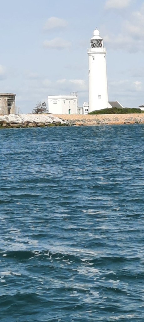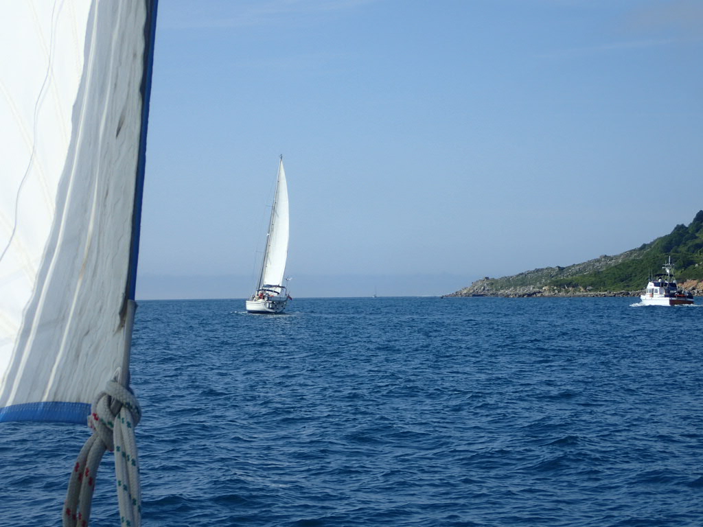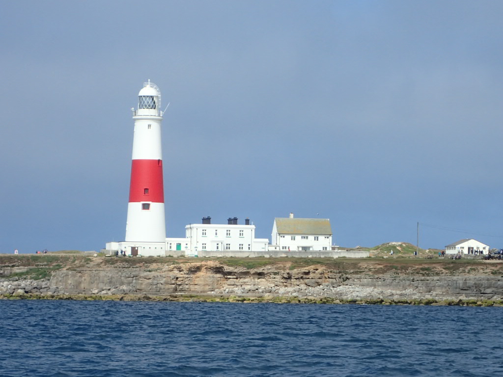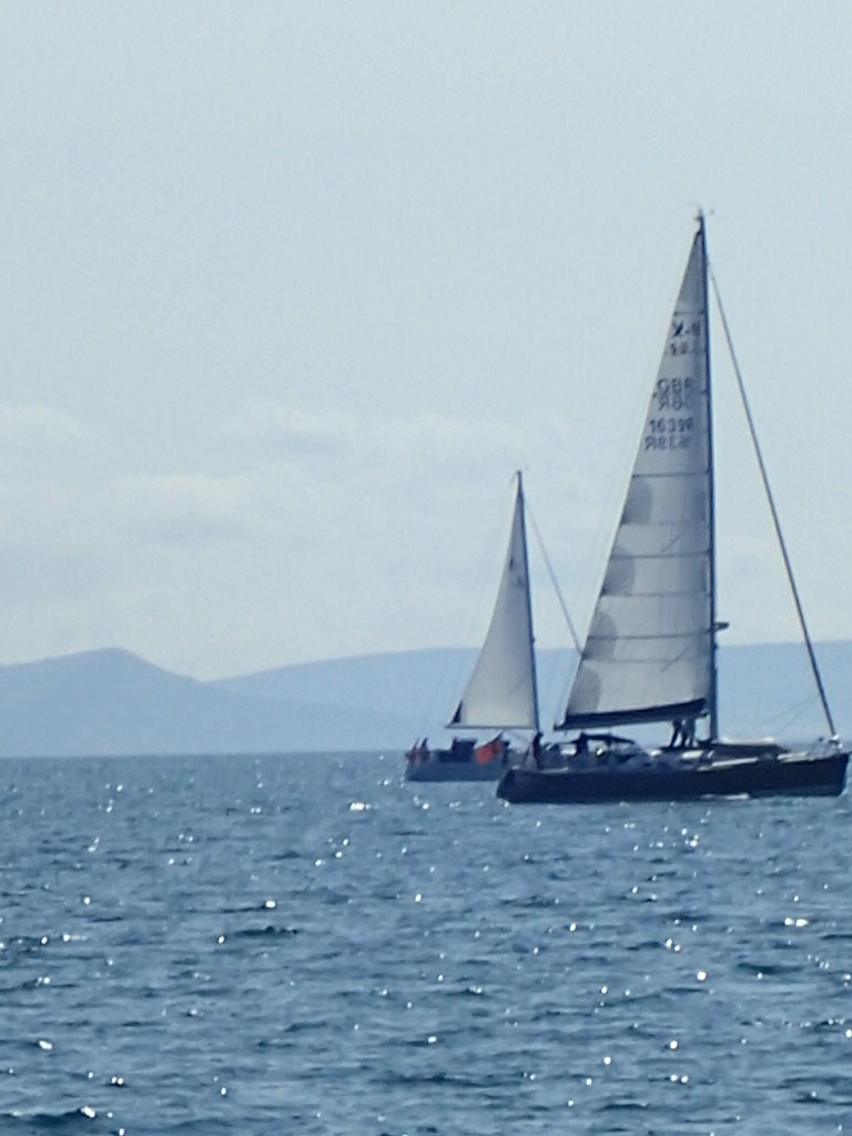Out of the harbour we shake out the reefs in the main and with a full genoa we are skimming along in company. Ride to the Bill is always fascinating as we are never more than a quarter of a mile (two and a half cables in very old money) from the old quarry workings and the rusting remains of cranes used to load chunks or Portland stone on the coasters. With a fair tide helping us, we race past the beach huts and the light house and the tourists….and then we’re out into the bay.