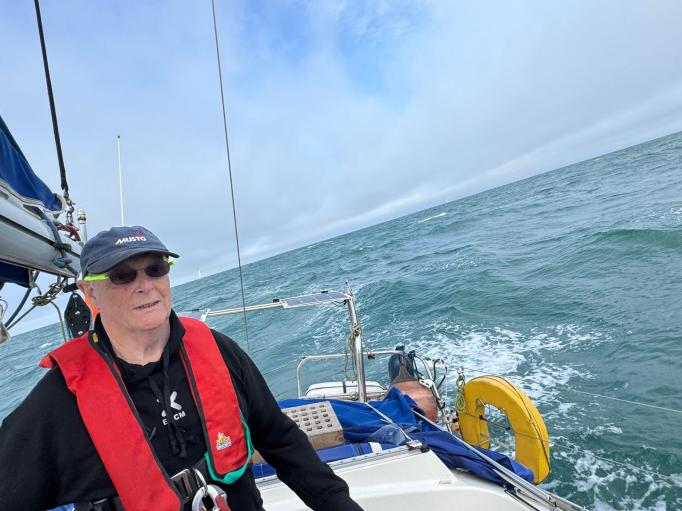 We tack down wind in around 12 knots of wind and consider getting the cruising chute out. The latest shipping forecast for the inshore area now talks about strengthening winds up to F6 with thundery showers towards late afternoon/evening. The chute stays in its locker and the swell and wind build through the afternoon, with the sun having to work ever harder to penetrate the deepening clouds.