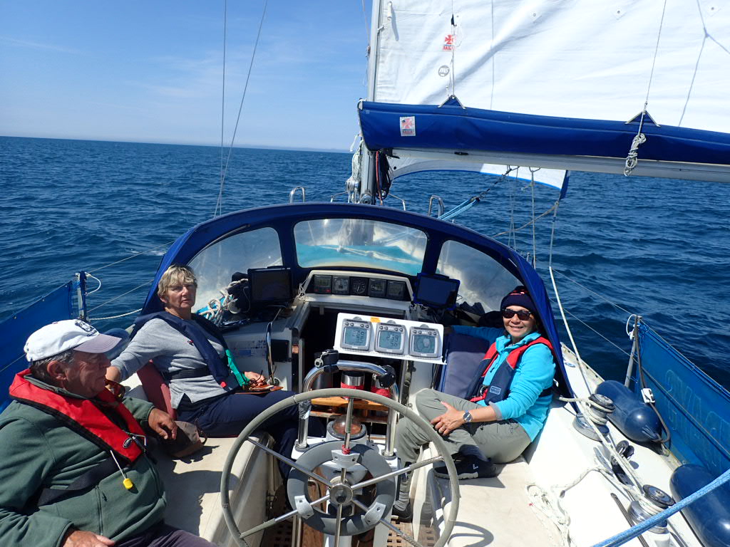 There is firing today on the Lulworth Ranges so we need to need to keep at least 3 ½ miles offshore. As it happens this suits us at the moment just in terms of where the wind is coming from so we head out south past a rather grey and overcast Swanage and leave Durlston behind on a beat into a chilly F5. The west going tide starts to make a mark and we begin the relatively slow passage west. Oddly there are a few boats behind us who opt for the passage closer inshore. Have we got the firing times completely wrong? We are vindicated a short while later as we hear the coastguard (relatively politely at first) requesting that they alter course to avoid being shot at….actually I made that last bit up, but a Navy protection boat most definitely makes things clear. Of the stunning Dorset Coast we see little, and Lulworth, Durdle Door and Chapmans Pool are points on the chart, passing by in the gloom. Never mind we say, this is June so we must be enjoying ourselves! Actually the sail is exhilarating as Heydays scuds along with a double reef main and a couple of rolls in the genoa. We have found over the years, that we could pile mo8re sail on and get maybe another half knot, but at the loss of balance and calm. So 5 to 6kts is fine by us and allows for a civilised and even peaceful cockpit. We catch a few decent spells of blue sky to remind us of what it could be like…