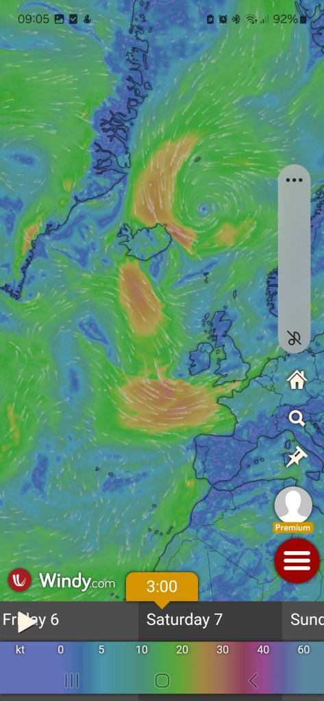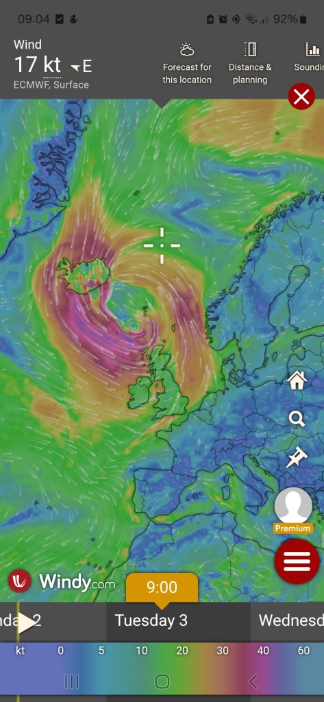 The weather forecast for the past few days have started to show a series of lows coming our way over the Atlantic with landfall and the associated nastiness arriving in time for the start of our jaunt along the SW coast. As it happens the winds are forecast to be around 18 to 24kts which is F5 or F6 but with larger gusts. This is perfectly doable, but the direction is on the nose…..