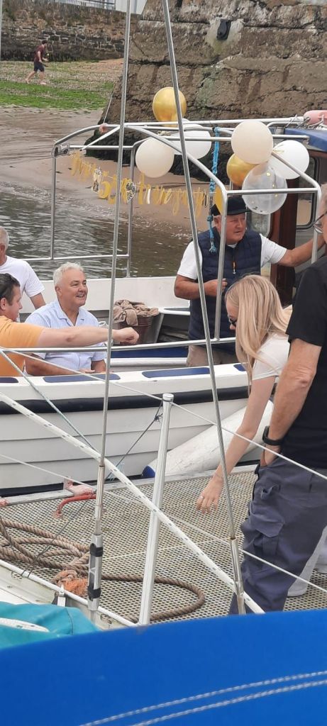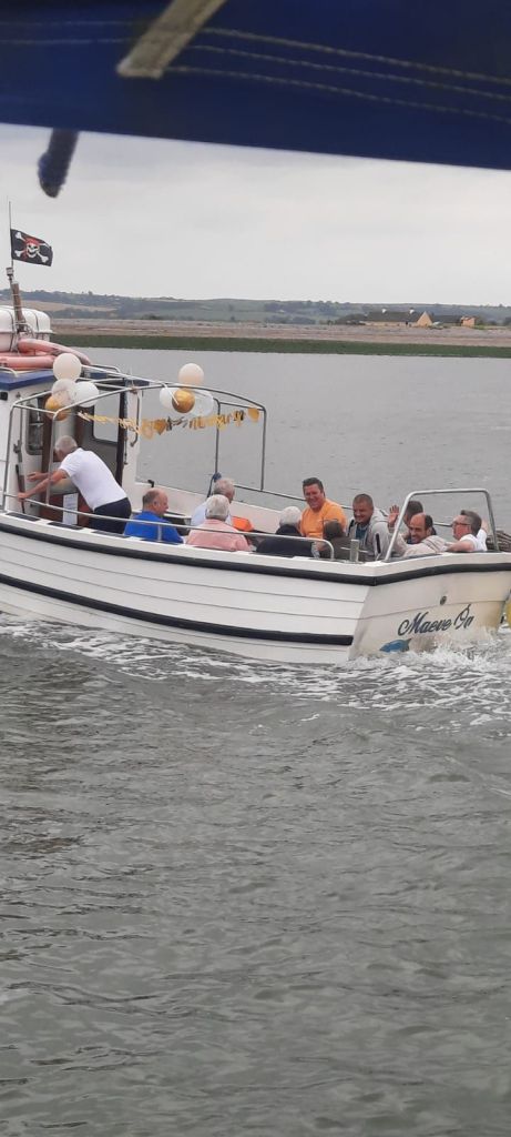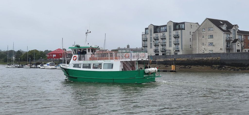 Youghal on a Saturday morning is not the busiest, presumably as a result of Friday night lock-ins. A pleasure boat is doing trips up river….apparently Dyson has a big and impressive house here….and he is dealing with a soon to be rowdy wedding anniversary party. Plenty of booze and nosh is loaded, and then to our surprise the women all get off leaving the men to their boozy cruise, while they are apparently off to “decorate the pub”.
