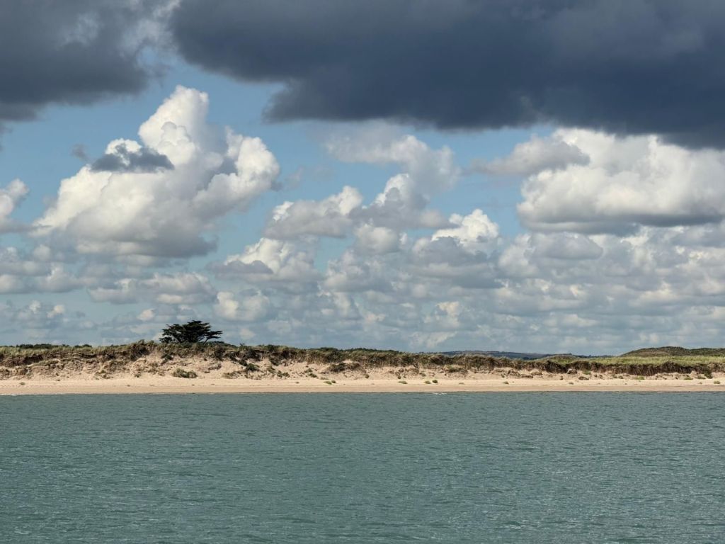 With the genoa down and stowed below, plus a final tidy up and polish, Heydays is ready to be left for a few weeks. We have time for a last walk out along the estuary just after low tide. An on-shore breeze seems to be creating some breakers over the sand bar at the entrance…note to selves for when we return…